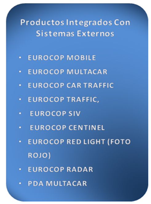 Para ello, hemos generado en EuroCop una capa de integración basada en Web Services y SOA, a fin de incorporar servicios de interoperabilidad con otros de sistemas de interés para los Cuerpos de Policía. A día de hoy, los Sistemas EuroCop están preparados para integrarse con sistemas externos como la DGT, Atex, Testra, Arena, Nostra-Dev, Avantius (Exp. Judiciales), Correos: Sicer y Serade, Tao (TSystems), Sistemas Municipales, G.I.S., etc. Es nuestro objetivo continuar desarrollando éstas y otras integraciones que se consideren de interés para las policías locales. Asimismo, mantener y mejorar las integraciones que ya se han realizado, dado que ellas facilitan enormemente las tareas de los Cuerpos de Policía y permiten disponer y mantener actualizados los datos de interés policial. Actualmente, estamos trabajando en la integración con otros organismos como son la DGP, SINDEPOL, SIRAJ, SIGO y ARGOS.